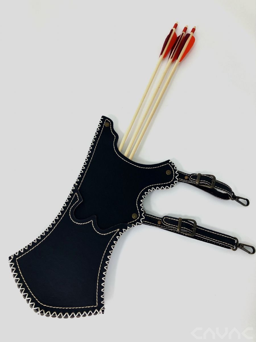 A Basic Turkish-style Quiver made from faux leather. This back quiver is an affordable option for those looking for traditional style on a budget. It’s modelled after Ottoman quivers, with a cylindrical body and simple strap. It holds several arrows and is suitable for youth or casual archers.