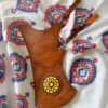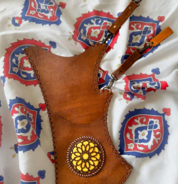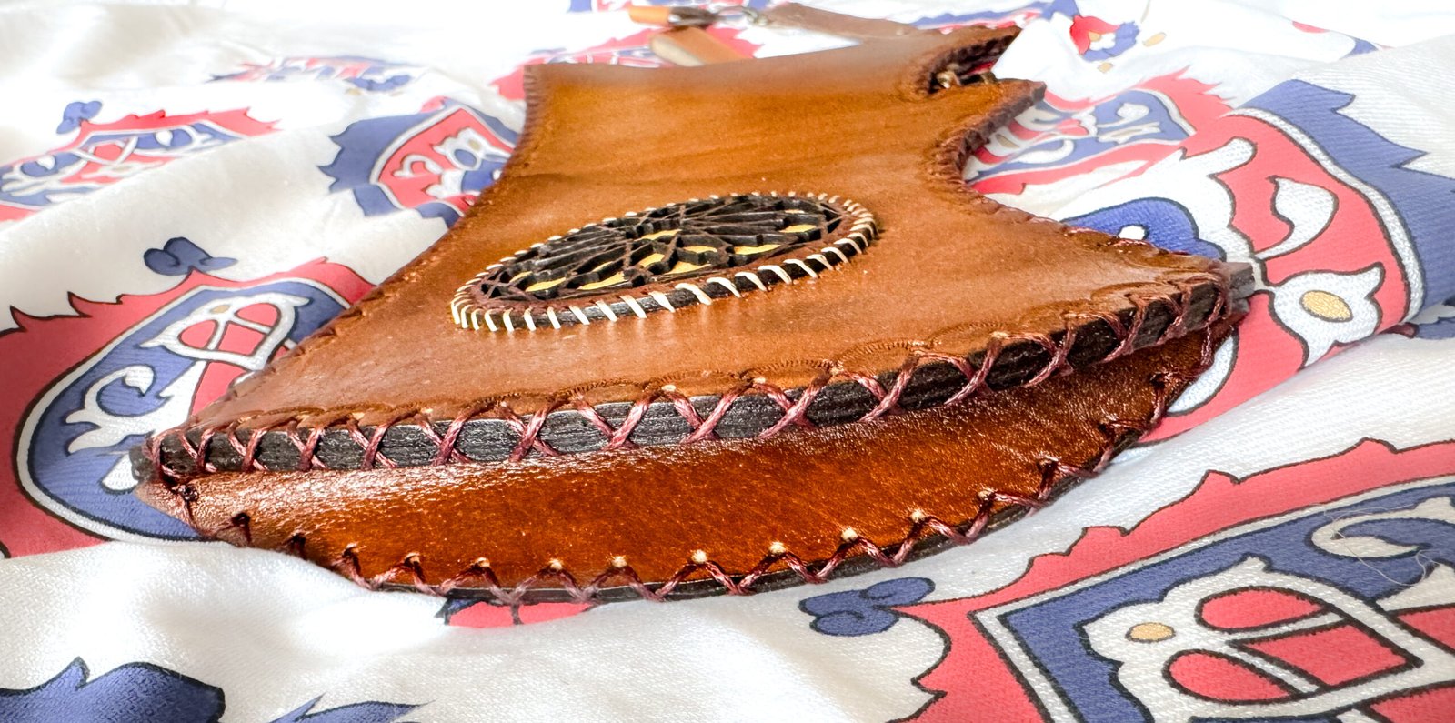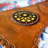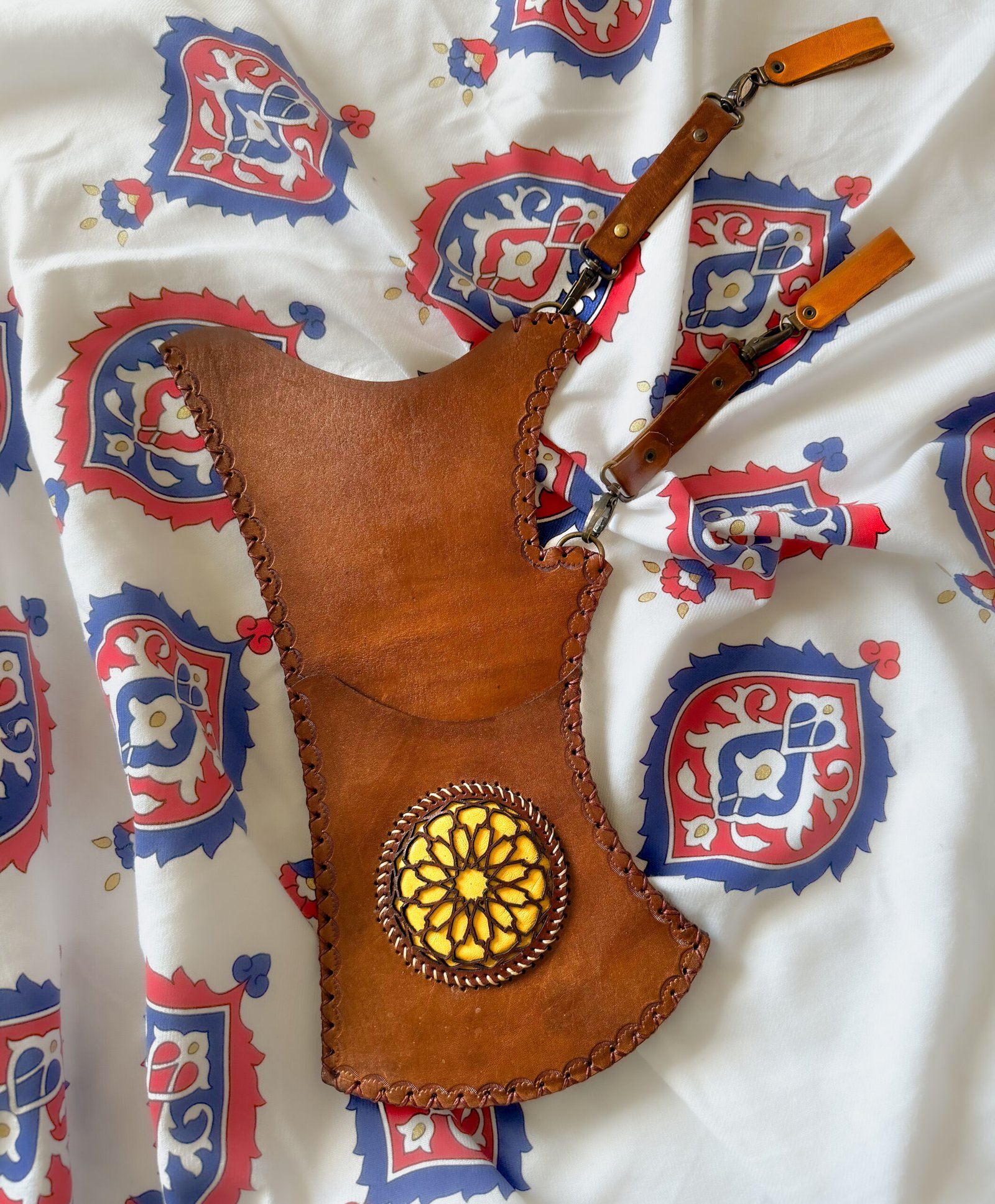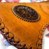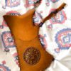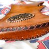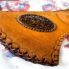Straps: Adjustable leather shoulder strap with brass buckle. May include small pouch on exterior for accessories (string, thumb ring, etc.). Length ~22″.
