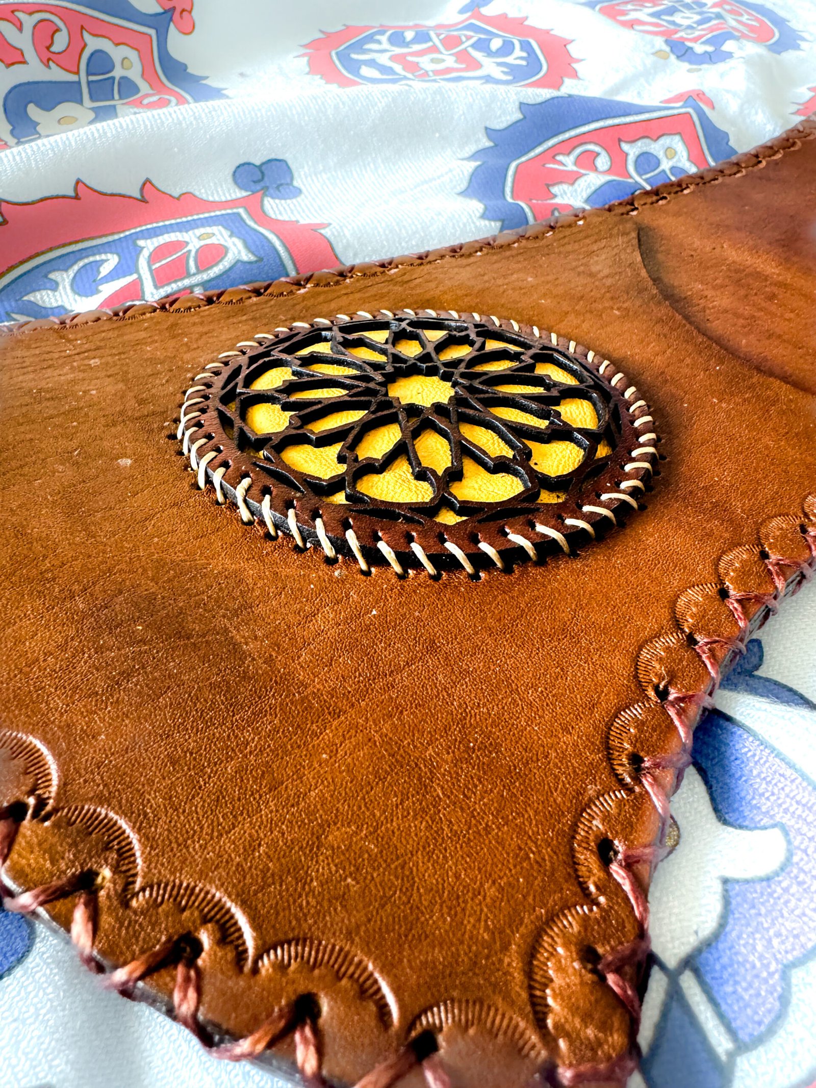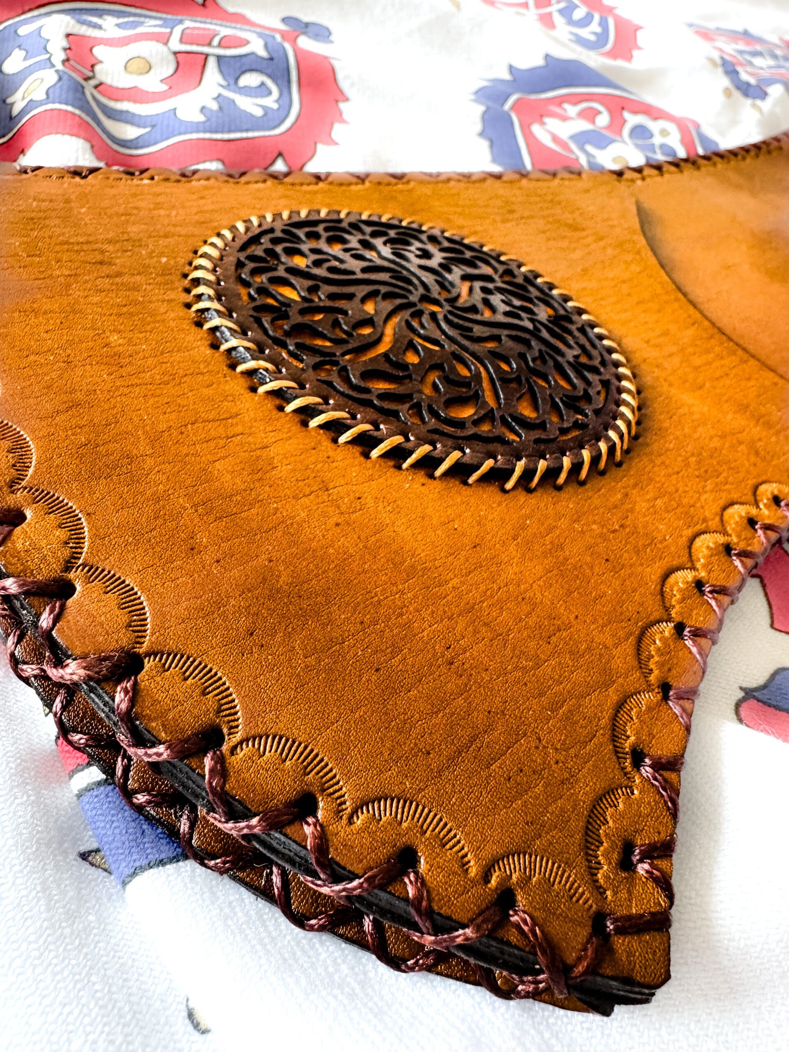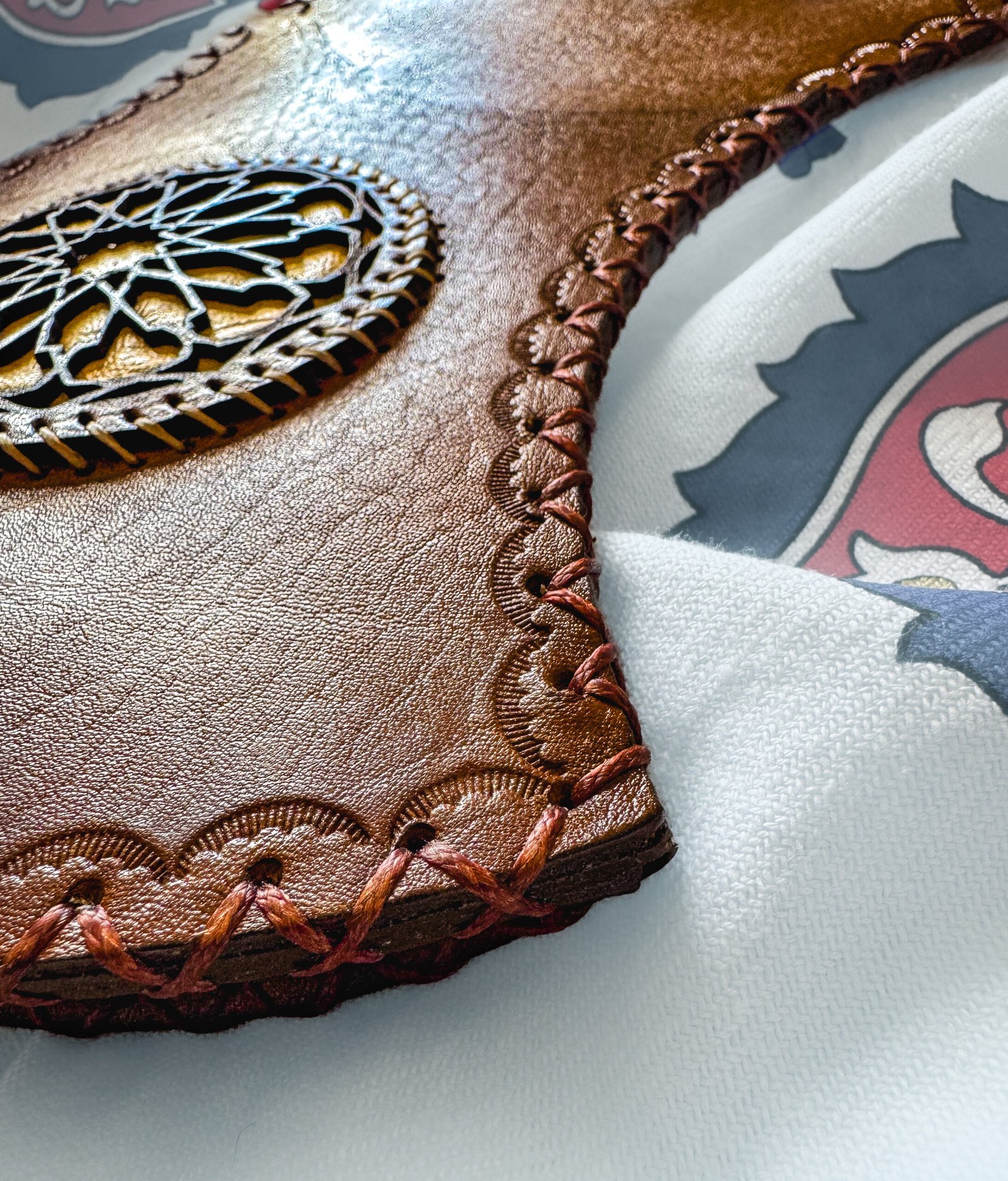 Design: Traditional Ottoman style with ornate tooling/ carving on the leather surface, and a reinforced bottom.